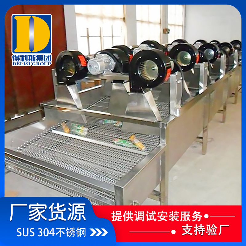 (3) 風干機除水后可直接裝箱,風干機實現(xiàn)連續(xù)作業(yè)(與連續(xù)工作殺菌機配套使用),只需將殺菌后的產品放入輸送網帶,經風干機產生的氣流經噴嘴噴射而出,從而達到包裝除水、除油漬、水垢等效果,即可裝箱入庫。